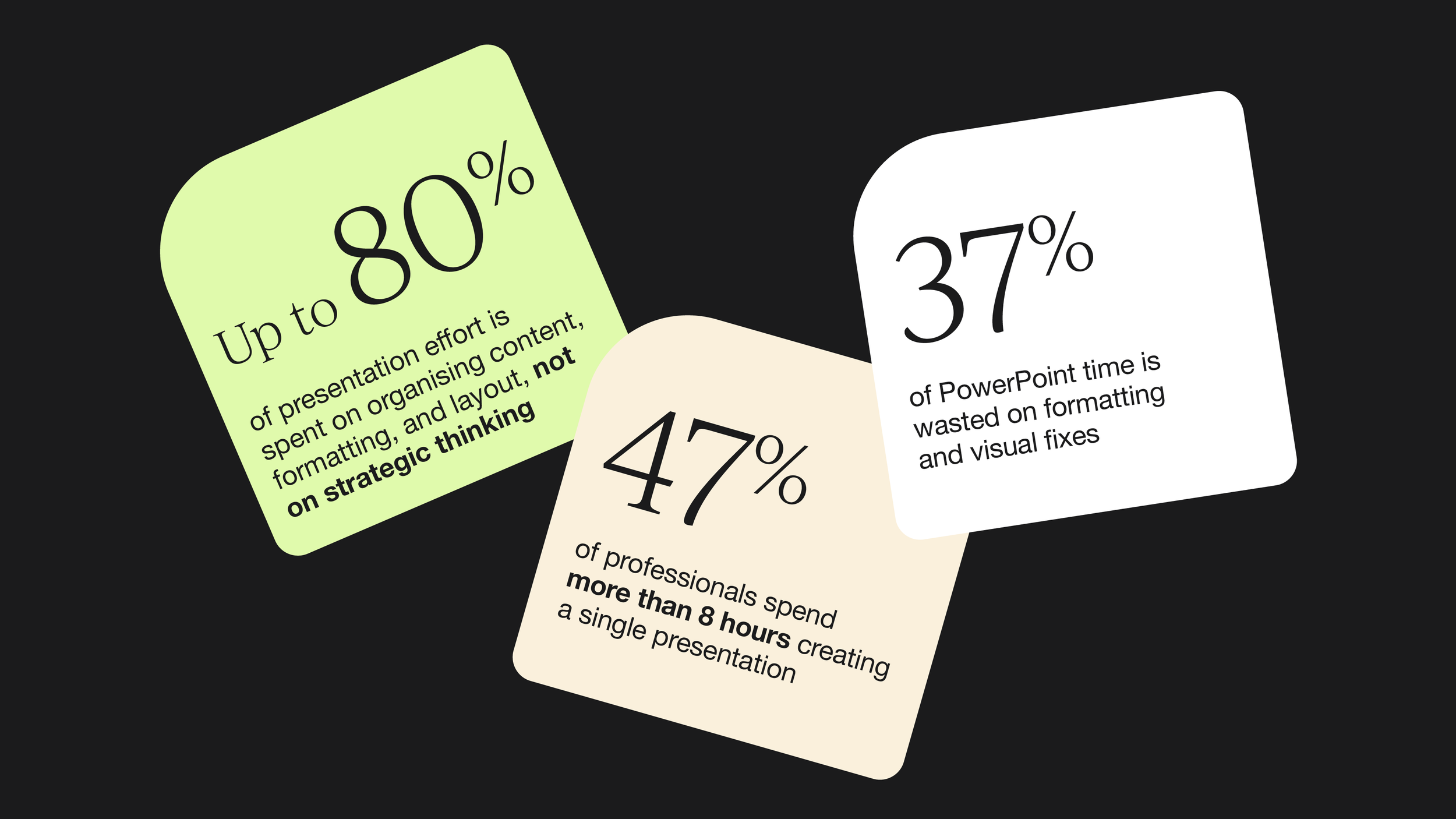 Up to 80% of presentation effort is spent on organising content, formatting, and layout, not on strategic thinking (WorldMetrics, Presenting Statistics)